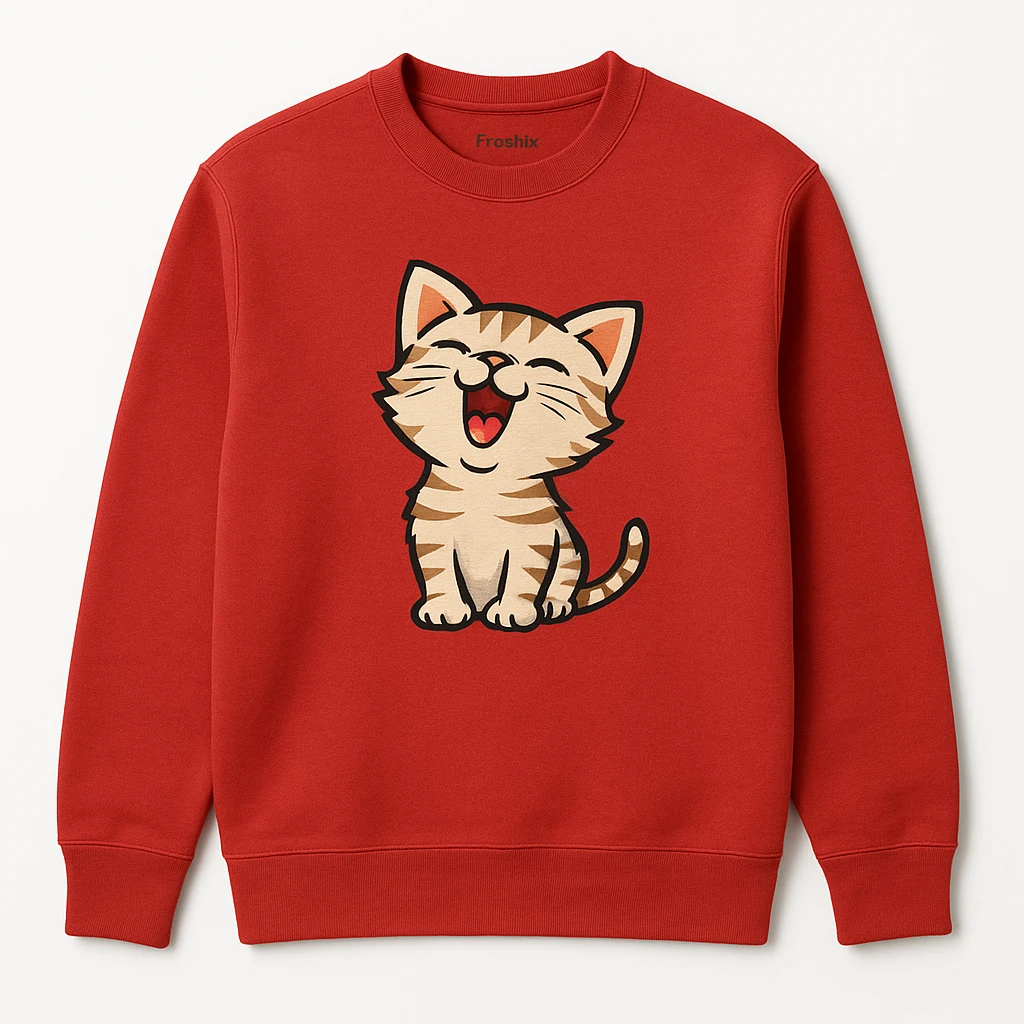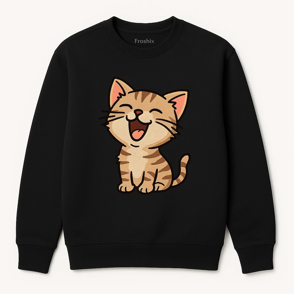 Imagine yourself strolling through a park or hanging out with friends, wearing this fun and cozy sweatshirt. The playful small laughing cat graphic on the chest adds a cheerful vibe to your outfit, making it ideal for casual outings or relaxed gatherings.